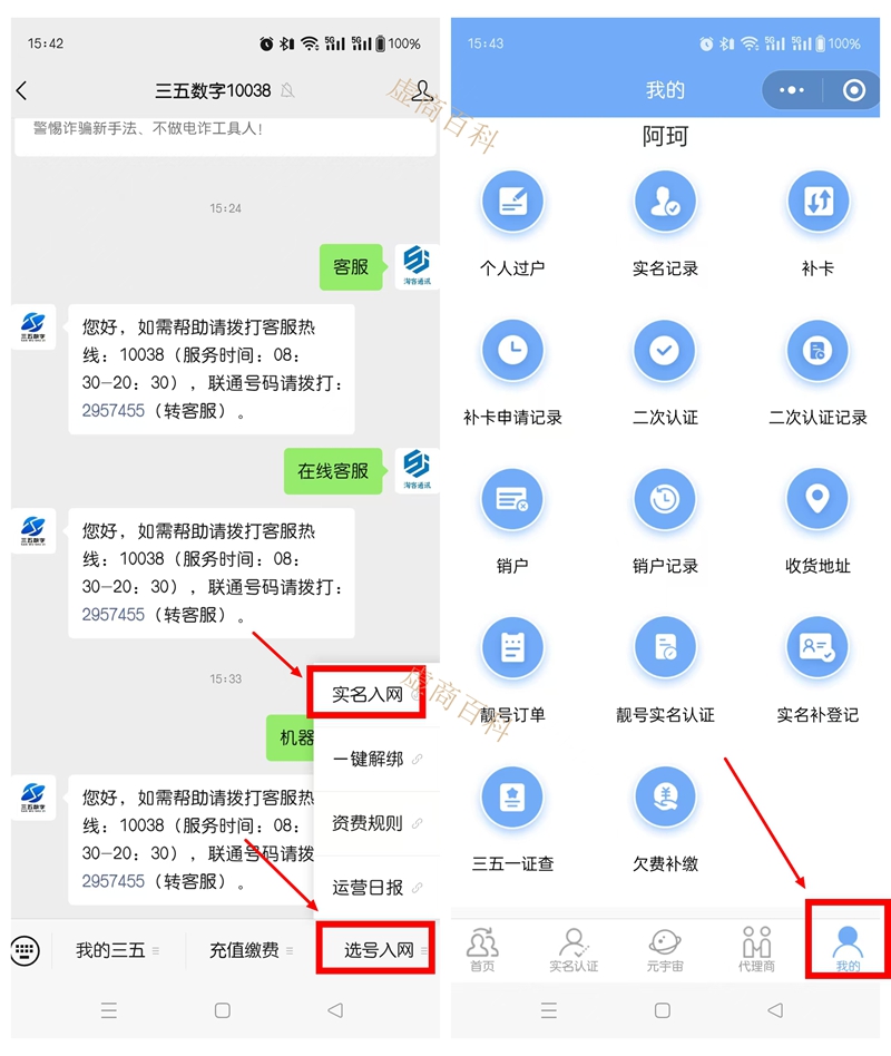 其中三五公众号的营业厅最全面,有实名、二次十名、查话费、充话费、补卡、过户、销户和查名下号码等所有功能,强烈推荐使用!